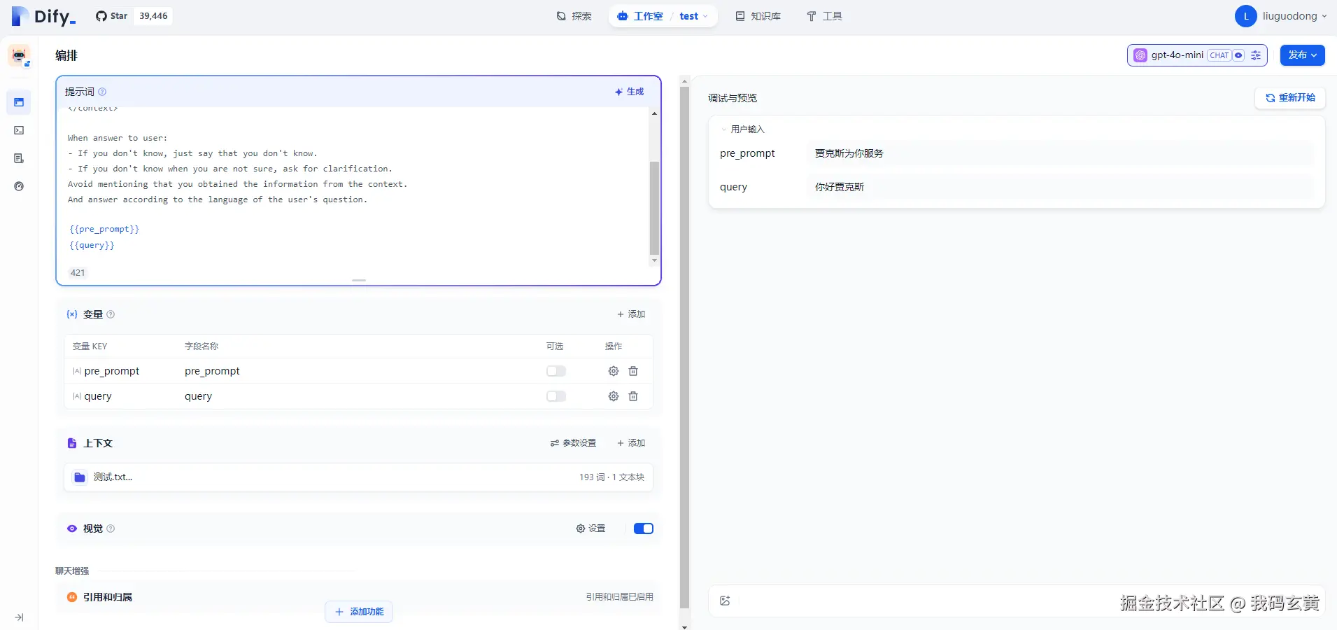 点击我们进行一系列提示词构建,然后发布,这里我添加了一个上下文文档,你也可以根据需要进行添加,我的提示词模版为: