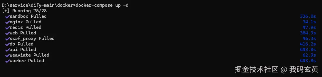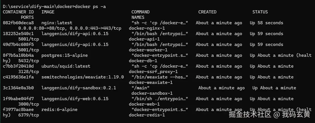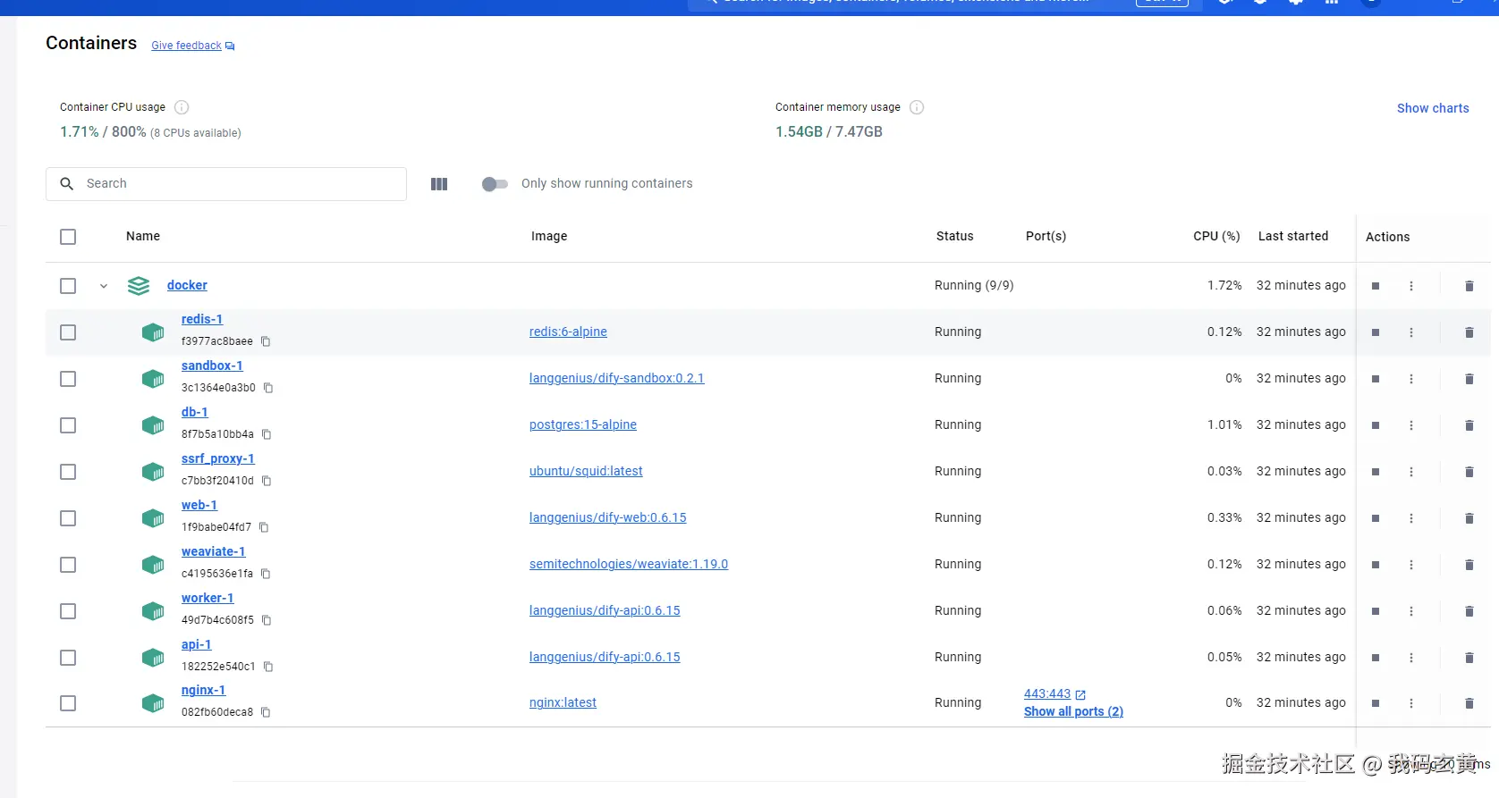上面这些就是我们 Dify 项目内部所需要的所有镜像,至此我们的项目环境已经搭建完毕。