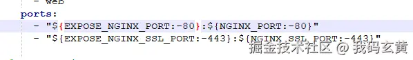 我们这里可以更改成自己不冲突的端口,打开 docker-compose.yaml 文件,找到里面的 nginx 配置项目,如下面所示: