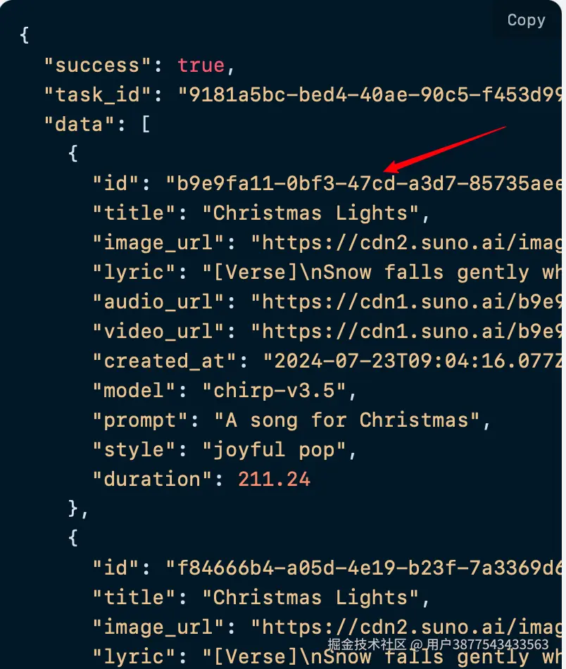 id是生成后歌曲的 ID,如果你不知道如何生成歌曲,可以参考上文的基本使用来生成歌曲。
