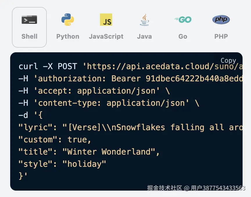 然而 Suno 官方是并没有提供 API 的,AceDataCloud 提供了一套 Suno 的 API,模拟对接了 Suno 官方,可以方便快捷地生成想要的音乐。