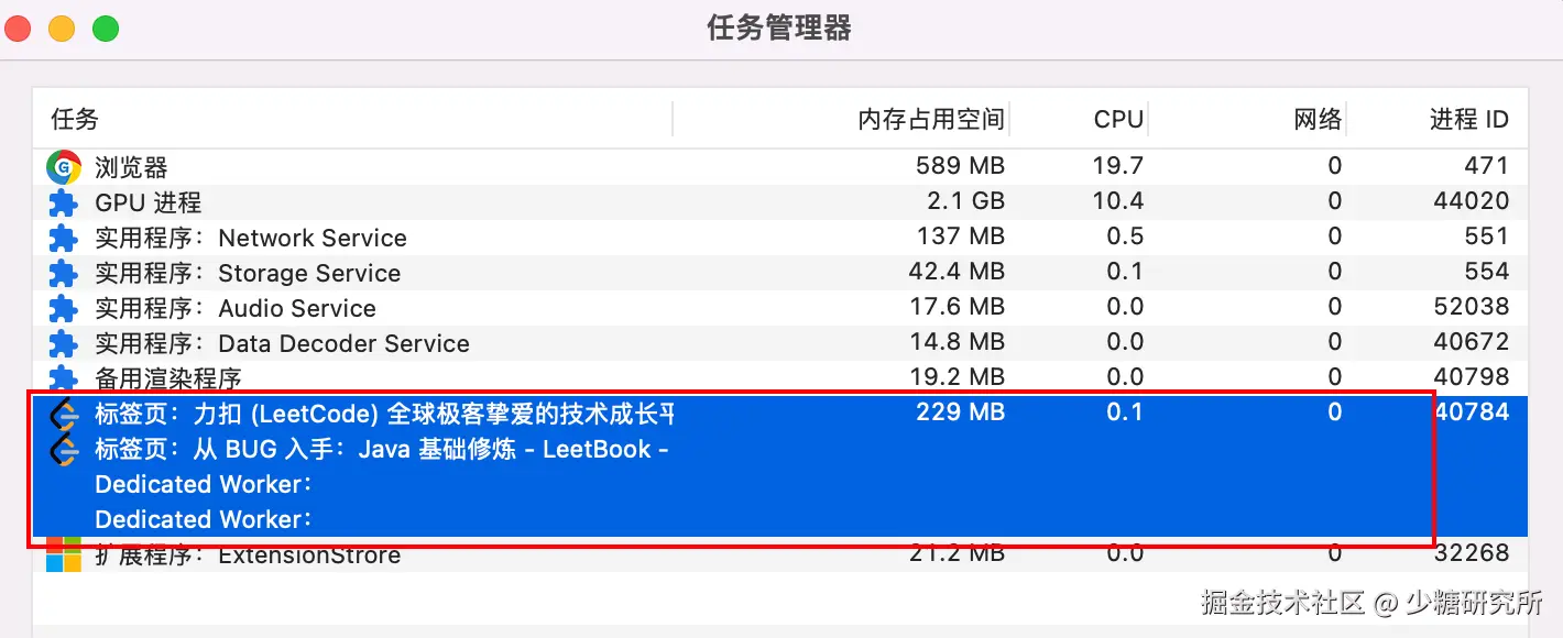 如果从一个标签页中打开了另一个新标签页,当新标签页和当前标签页属于同一站点的话,那么新标签页会复用当前标签页的渲染进程。官方把这个默认策略叫process-per-site-instance。如下图leeCode网站: