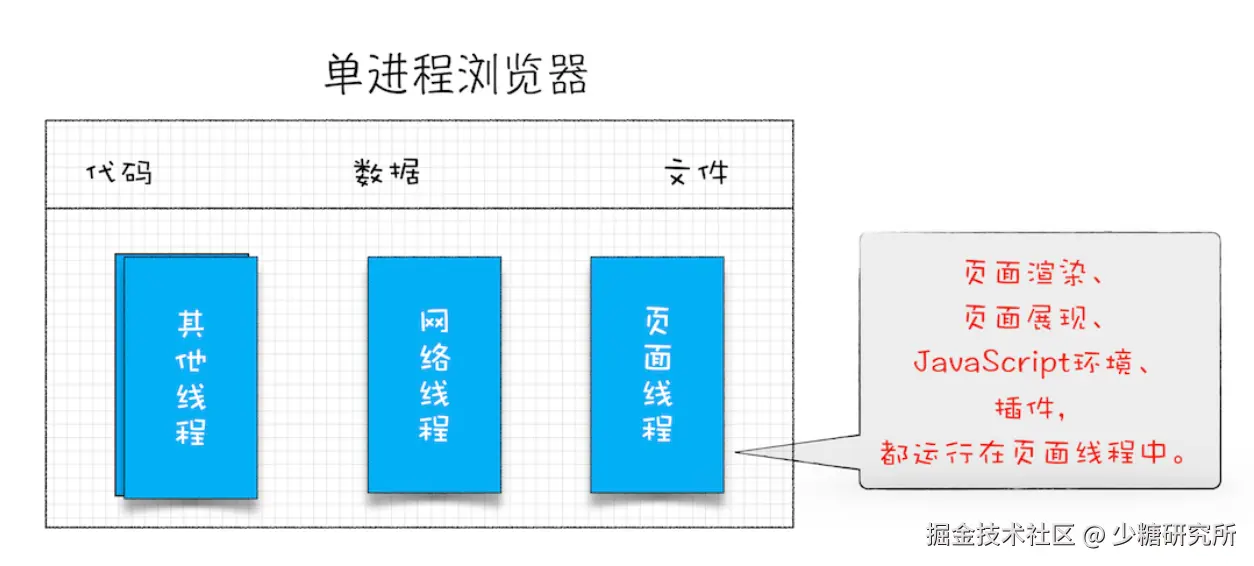 一句话概括:浏览器的所有功能模块都运行在同一个进程里。