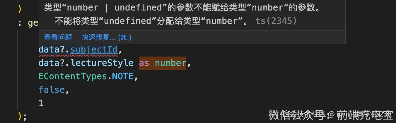 这里就提示我们这个参数可能是undefined,而通过业务知道这个值是一定存在的,所以就可以将它断言成数字:data?.subjectId as number
