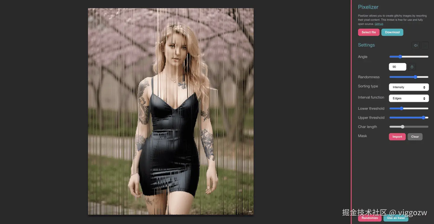这个开源项目是一个基于Web的故障图像处理器,通过“排序像素”来实现。根据可控的算法对像素内容进行混排,以产生扭曲的效果