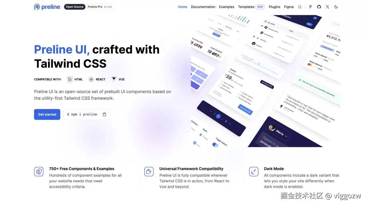 - 750+免费组件和示例:Preline UI提供了广泛的组件和示例,可以满足各种网站需求,所有组件和示例都符合可访问性标准。