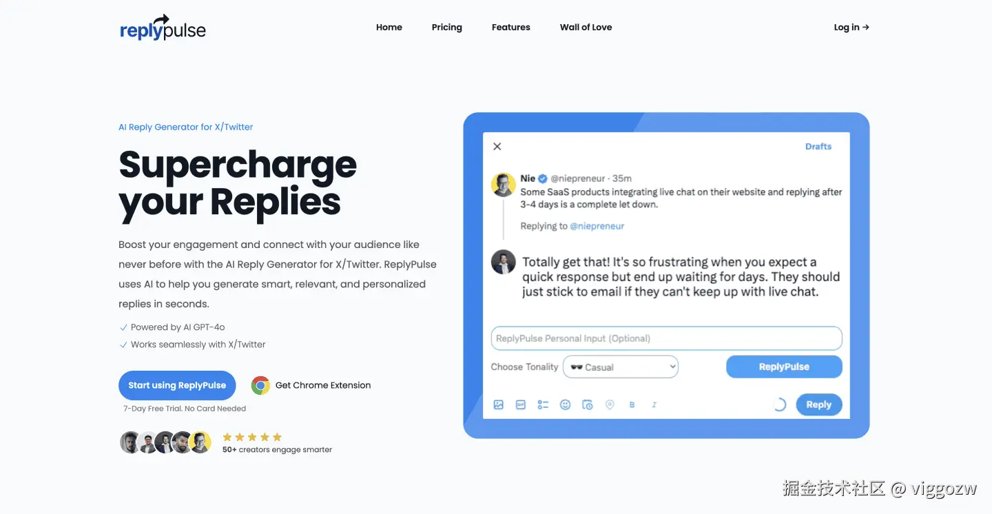 X/Twitter 的 AI 回复生成器,功能很明显:扩大影响力,提高您在 X/Twitter 上的知名度。