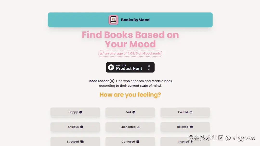 这个项目挺有意思的,可以根据您的心情查找书籍,提供个性化的书籍推荐以满足您的情感需求,BooksByMood 上的每本书在 Goodreads 上的平均评分为 4.09/5