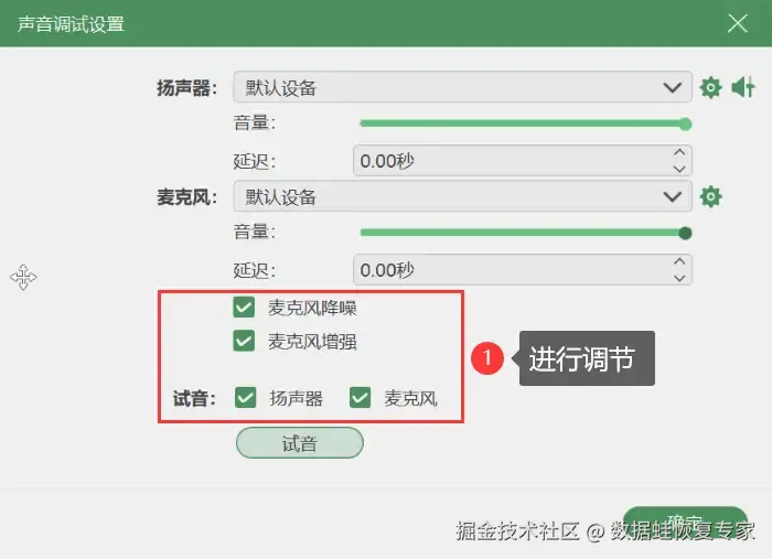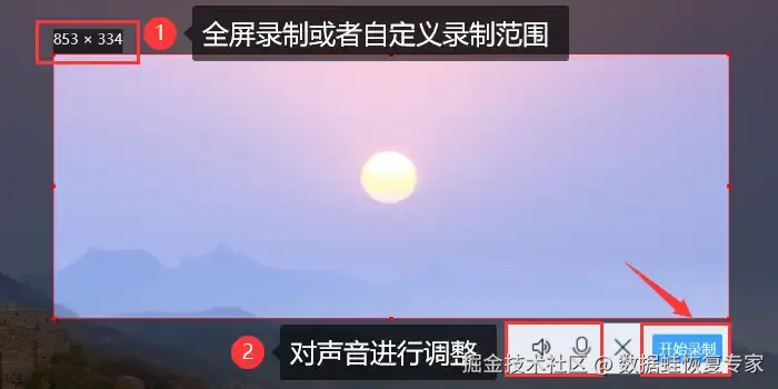 步骤2:可选择全屏录制或者自定义区域录制,打开录制声音并进行调整。