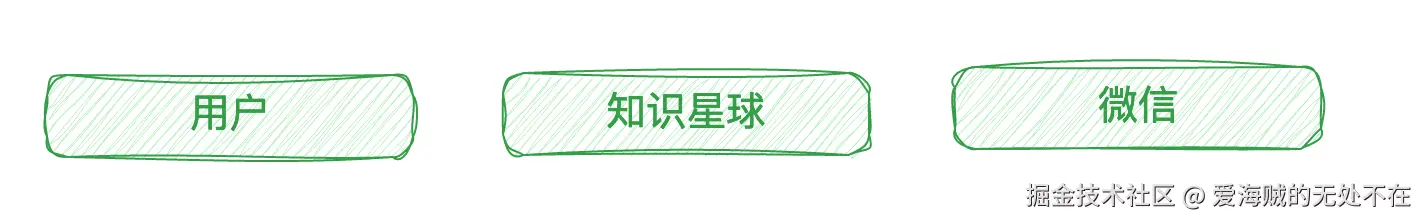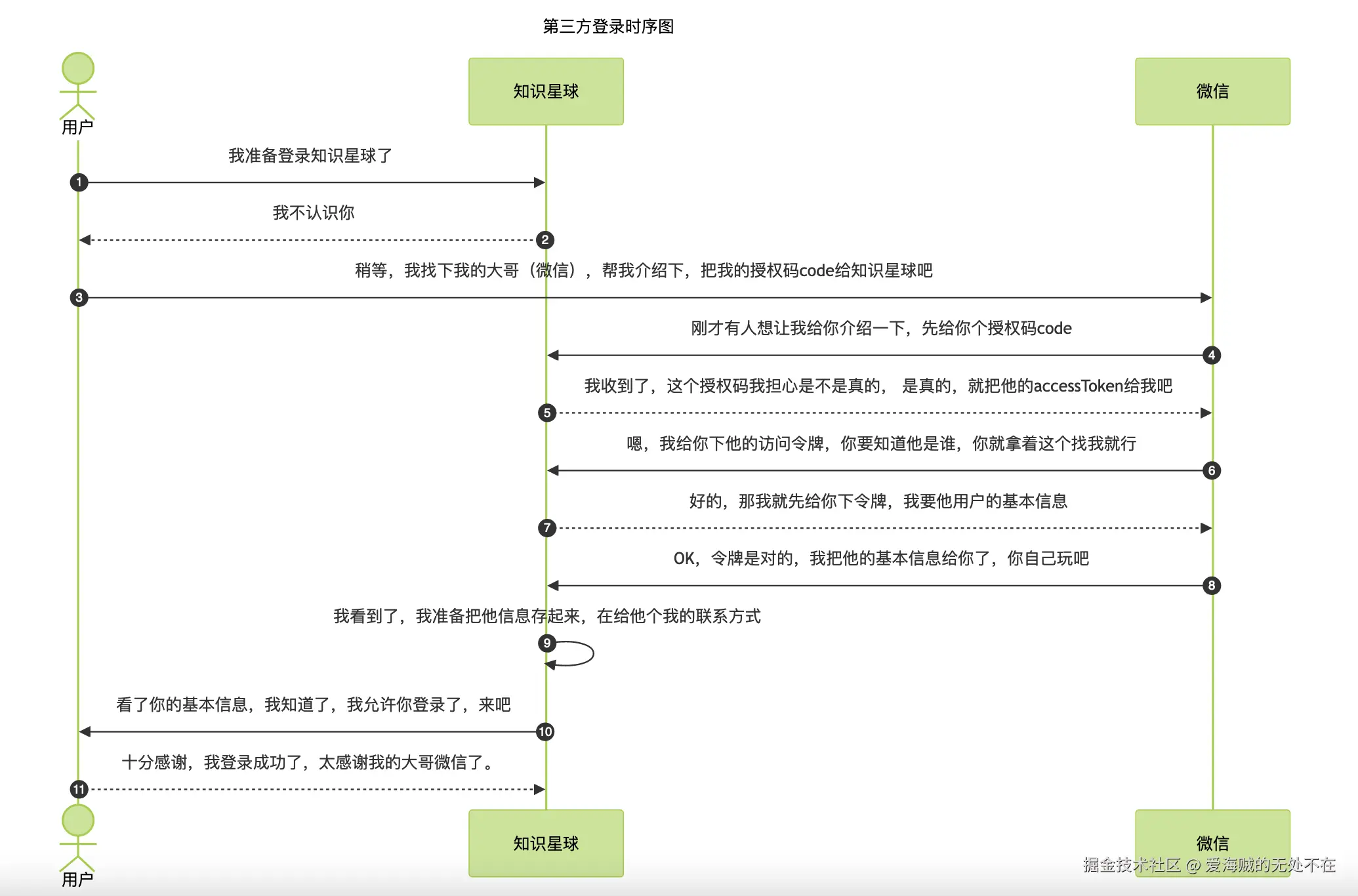 在JustAuth的官方文档中,有这样一个大白话来描述了第三方登录的过程,这里我根据其描述,用知识星球的微信登录作为例子,来描述下知识星球的微信登录的这个第三方登录的基本过程。首先我定义了3个参与的角色信息: