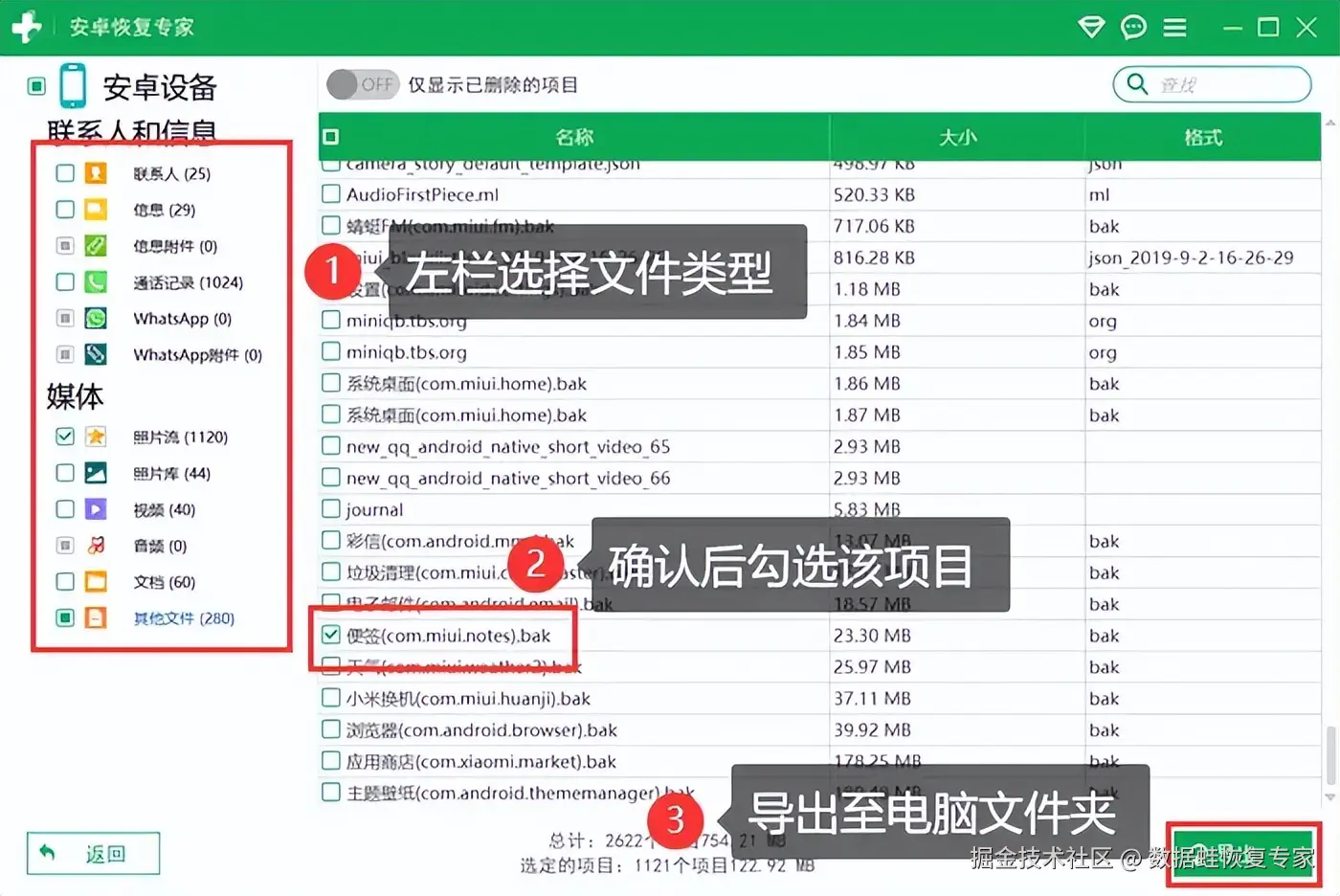 步骤3:完成后,我们将可以看到可恢复的数据列表。在左栏中选择文件类型,然后再查找需要恢复的对象,勾选它们。最后,点击 【导出】 就能够将数据保存到电脑。
