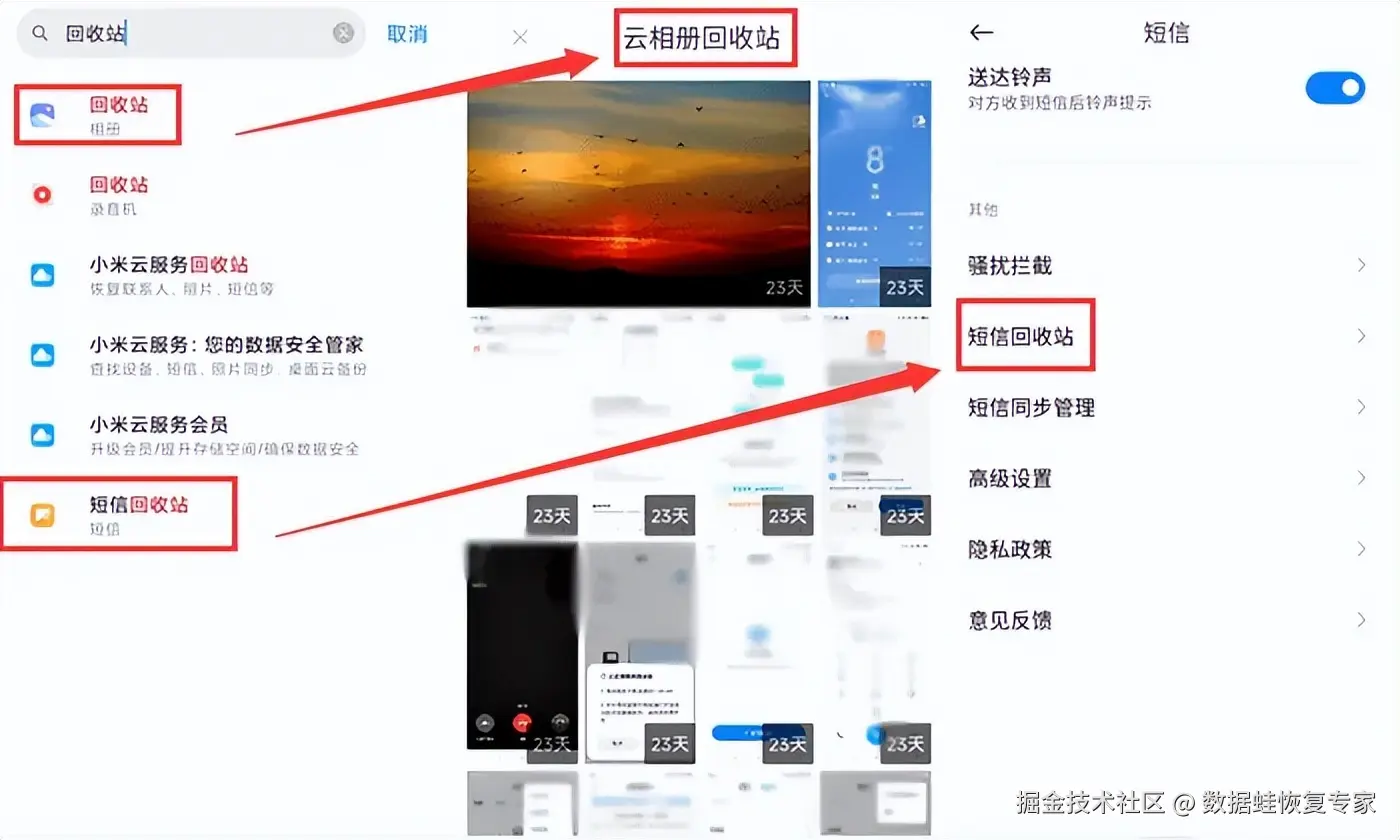 造成存储空间不足的原因多种多样,包括应用程序缓存的积累、大量多媒体文件的存储等。当遇到这些问题时,大部分人首选的数据恢复的方法是删除手机内存。但当不小心将重要信息清除,只能追悔莫及。不过,我们的安卓手机还提供了一项超级实用的功能——回收站!例如相册回收站和短信回收站: