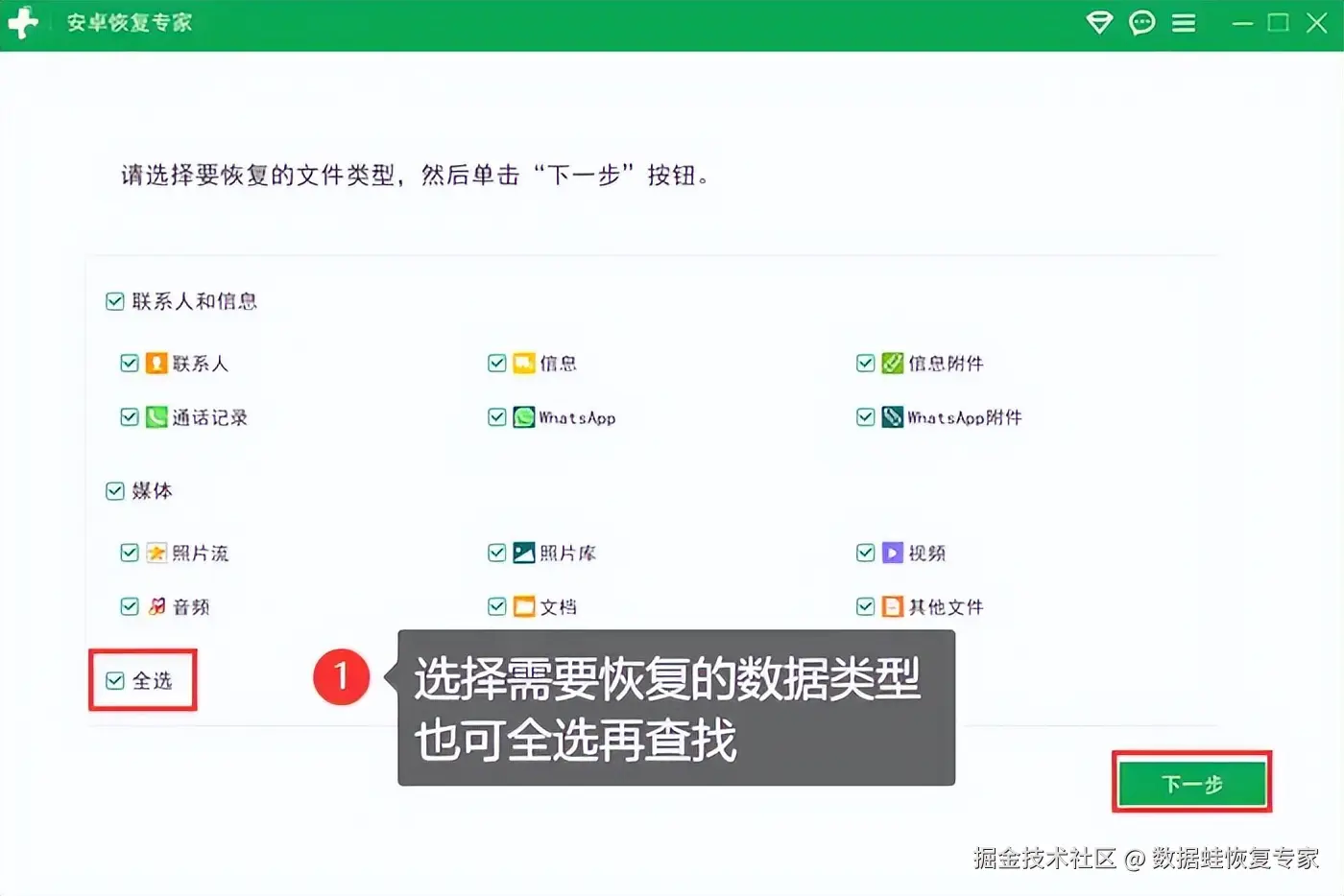 步骤2:在软件页面中,根据具体情况选择适合的恢复对象,例如 【全选】 ,即可扫描手机所有数据。