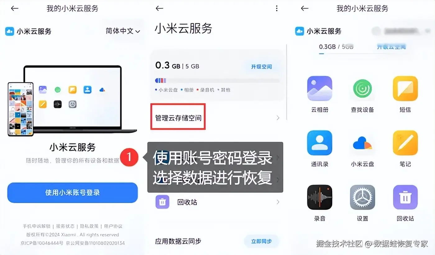 步骤1:打开手机设置,使用账号密码登录手机云服务,进入云空间;