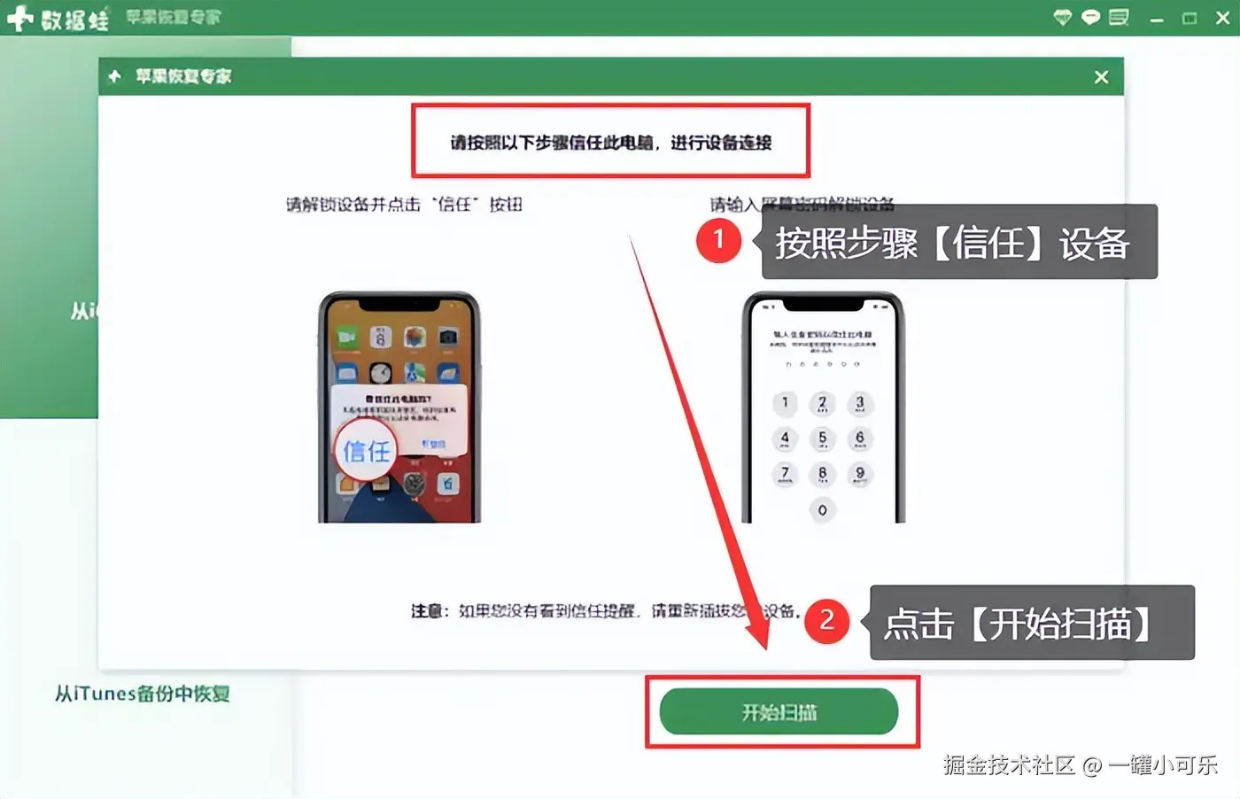 步骤2:使用USB数据线将你的苹果手机连接到电脑上。连接时,可能需要在手机上信任该电脑。打开软件运行,选择 【从iOS设备中恢复】 选项。点击 【扫描】 按钮,软件将开始扫描你的苹果手机,寻找已删除的qq好友数据。