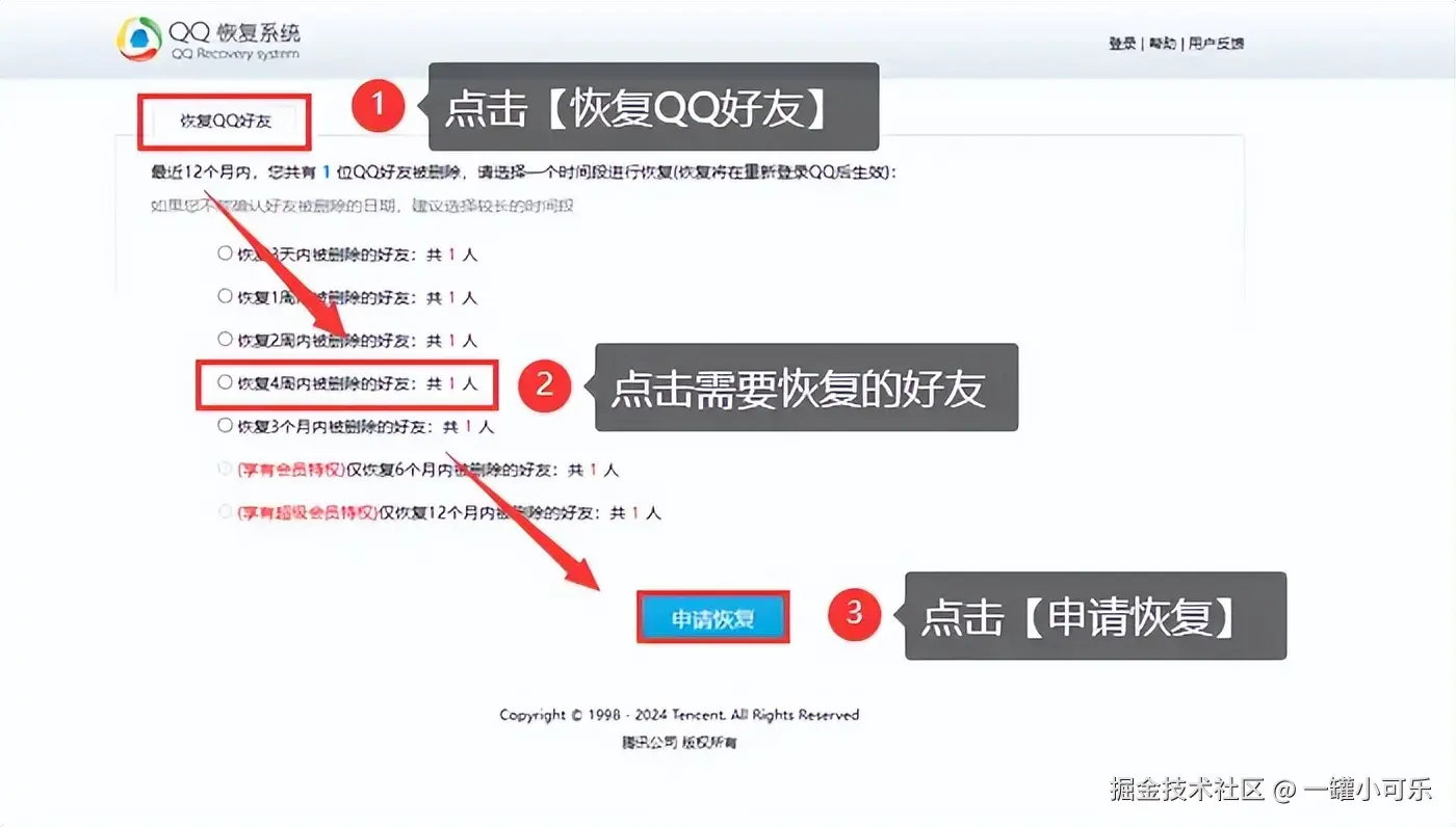 步骤2:登录成功后,找到 【恢复qq好友】 的选项,点击进入,找到你想要恢复的好友,点击下方的 【申请恢复】 按钮即可。