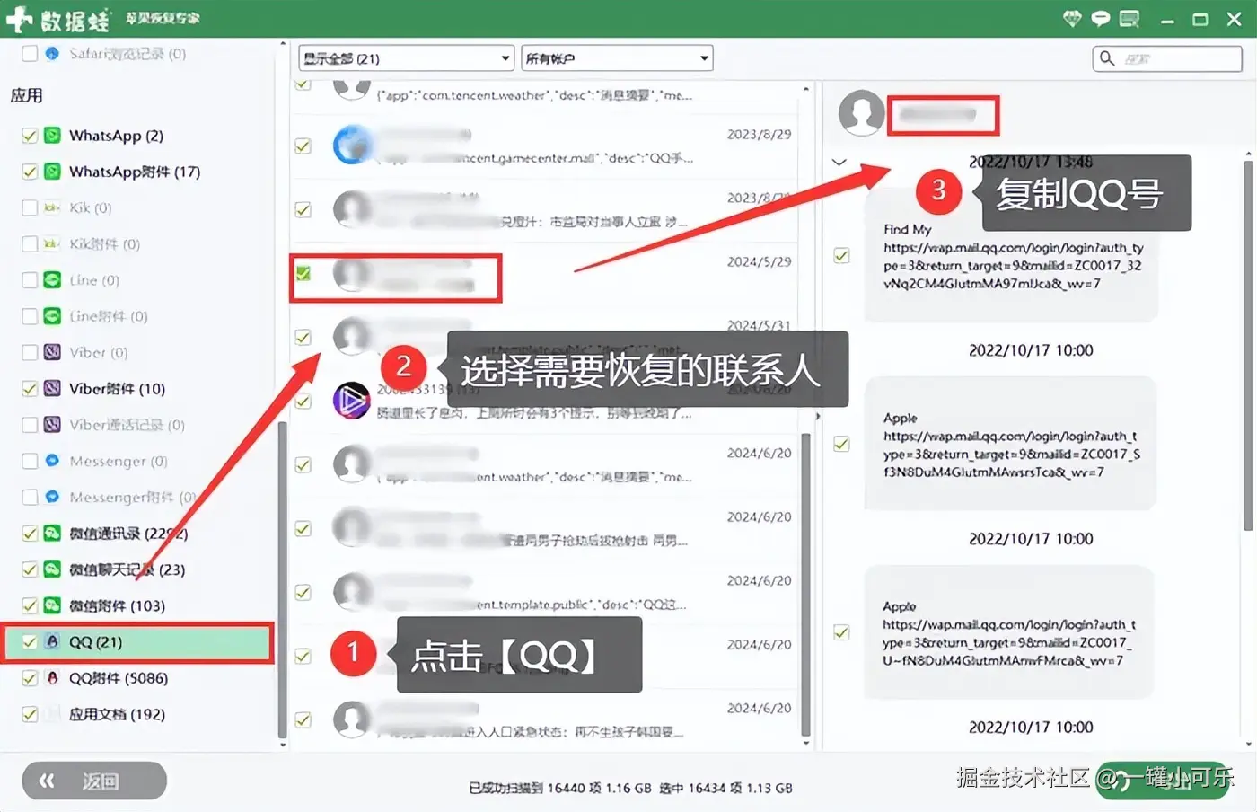 步骤3:扫描完成后,软件会展示一个包含已删除数据的列表。在列表中找到 【qq好友】 的选项,点击进入。你将看到一个预览窗口,里面列出了可恢复的qq好友。仔细浏览列表,找到你想要恢复的好友。选中该好友后,复制其qq号到手机上搜索添加即可。