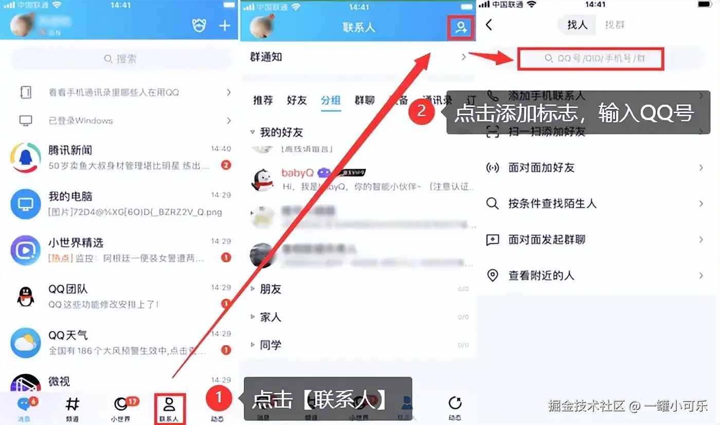 步骤1:点击 【联系人】 选择项,在联系人列表的顶部,点击 【添加好友】 的按钮。