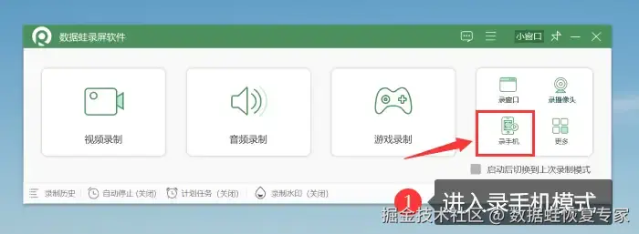 步骤1:在您的电脑上下载并安装好数 据 蛙录屏软件,点击进入软件的主页,选择 【录手机】 模式进入。