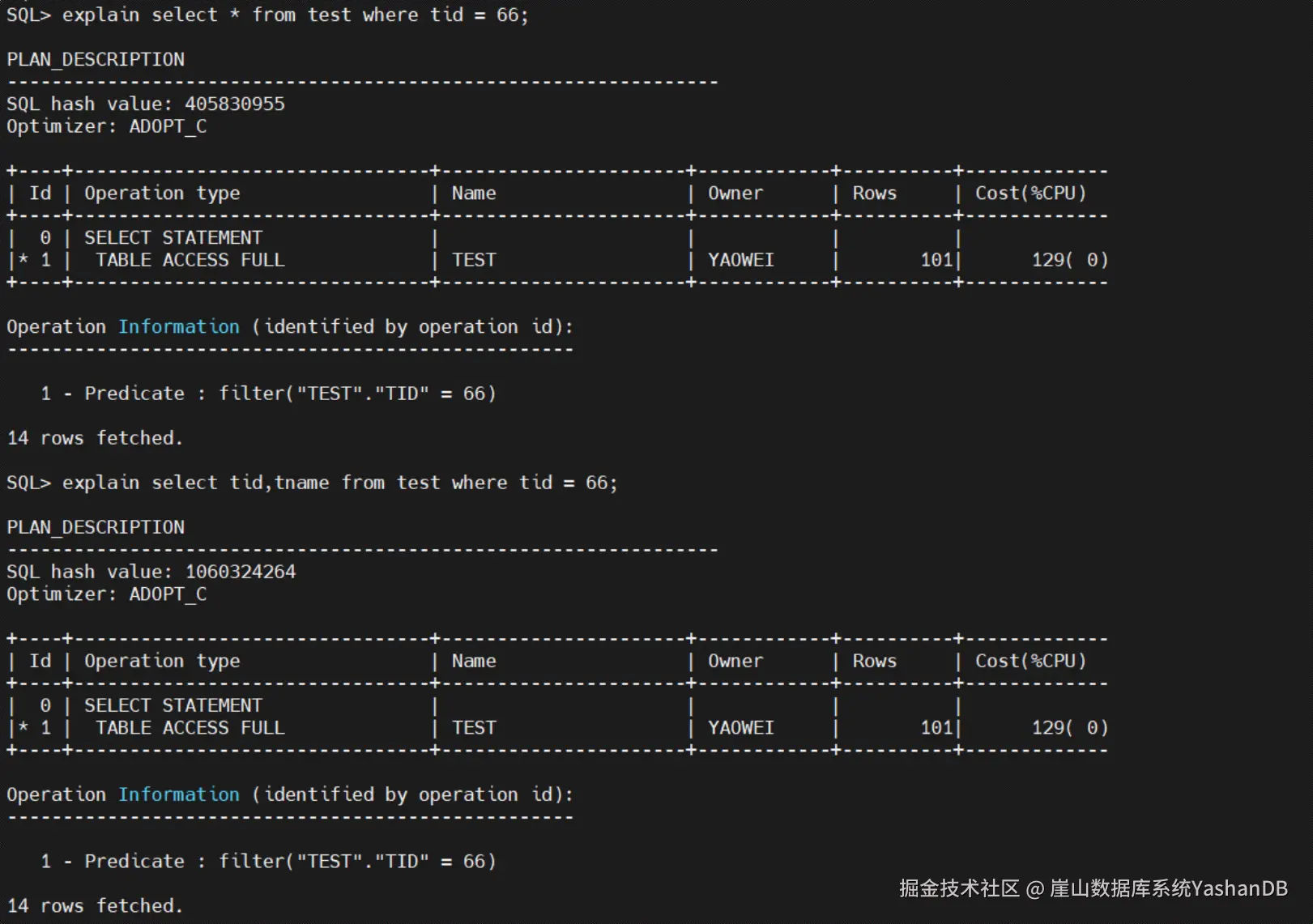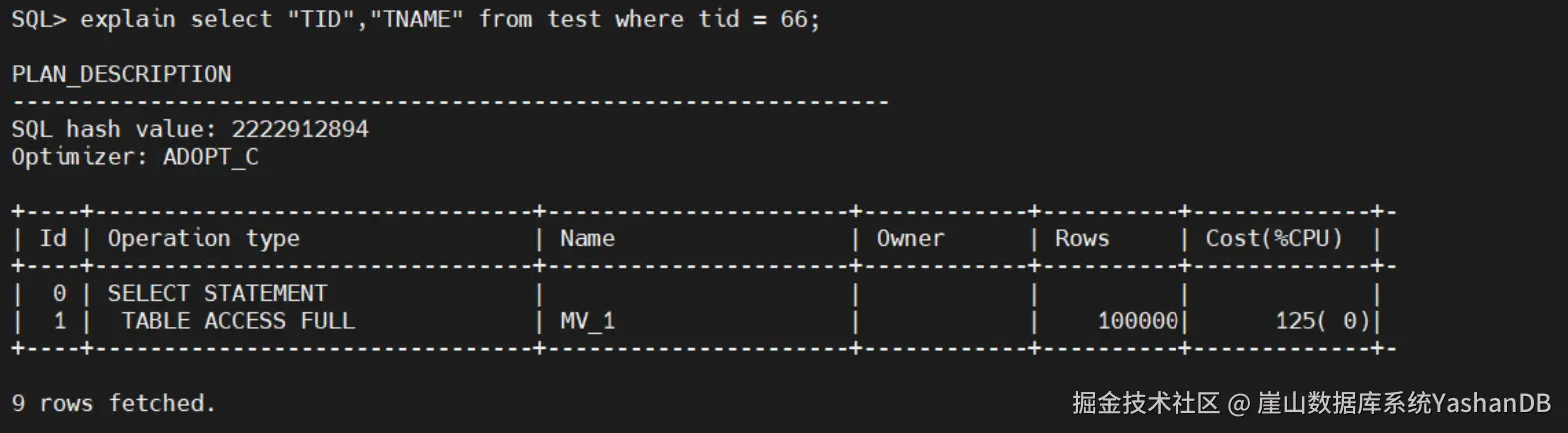 使用select * from test where tid = 66以及select tid,tname from test where tid = 66,均无法进行查询重写: