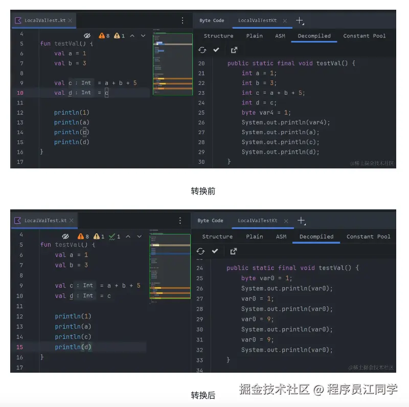 常量优化是一种优化技术,可以在编译时将变量的值替换为常量,从而提高程序的运行效率。在 Kotlin 中,编译器会对 const 声明的常量进行优化,但是对于 val 声明的变量,虽然是不可变的,但编译器却不会进行常量优化。本文介绍了如何通过 Kotlin 编译器插件 KCP 实现 val 声明变量的常量优化。