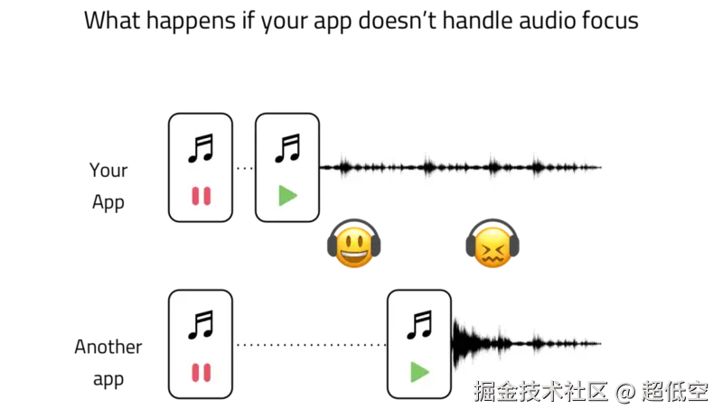 当你的应用需要输出音频时,需要请求获得音频焦点,获得焦点后,就可以播放声音了。当其他应用请求焦点时,会抢占你持有的音频焦点,此时,你的应用应暂停播放或降低音量,以便于用户听到新的音频源。