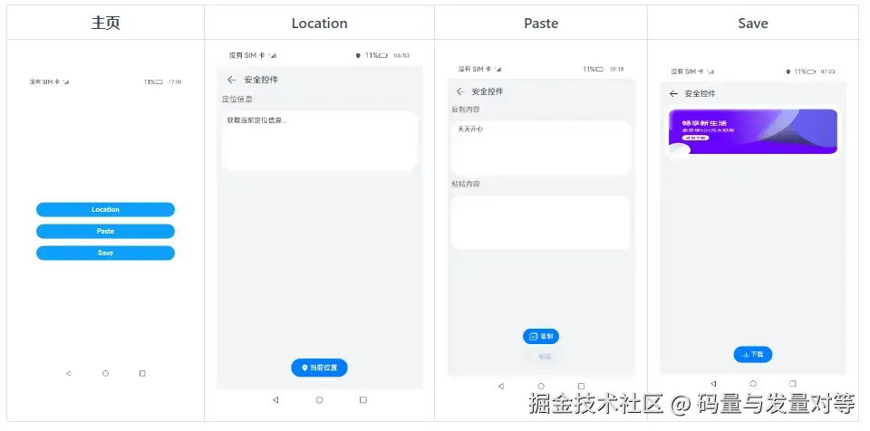 本示例分为Location安全控件模块,剪贴板安全控件模块,媒体库安全控件模块