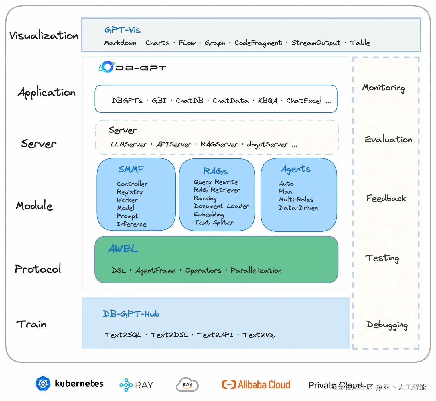 数据源: 对接各类数据源,实现生产业务数据无缝对接到DB-GPT核心能力。