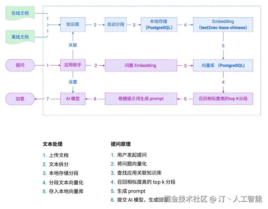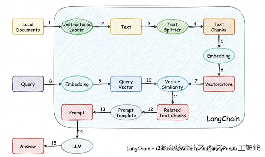 原理如下图所示:过程包括加载文件 -> 读取文本 -> 文本分割 -> 文本向量化 -> 问句向量化 -> 在文本向量中匹配出与问句向量最相似的 top k个 -> 匹配出的文本作为上下文和问题一起添加到 prompt中 -> 提交给 LLM生成回答。