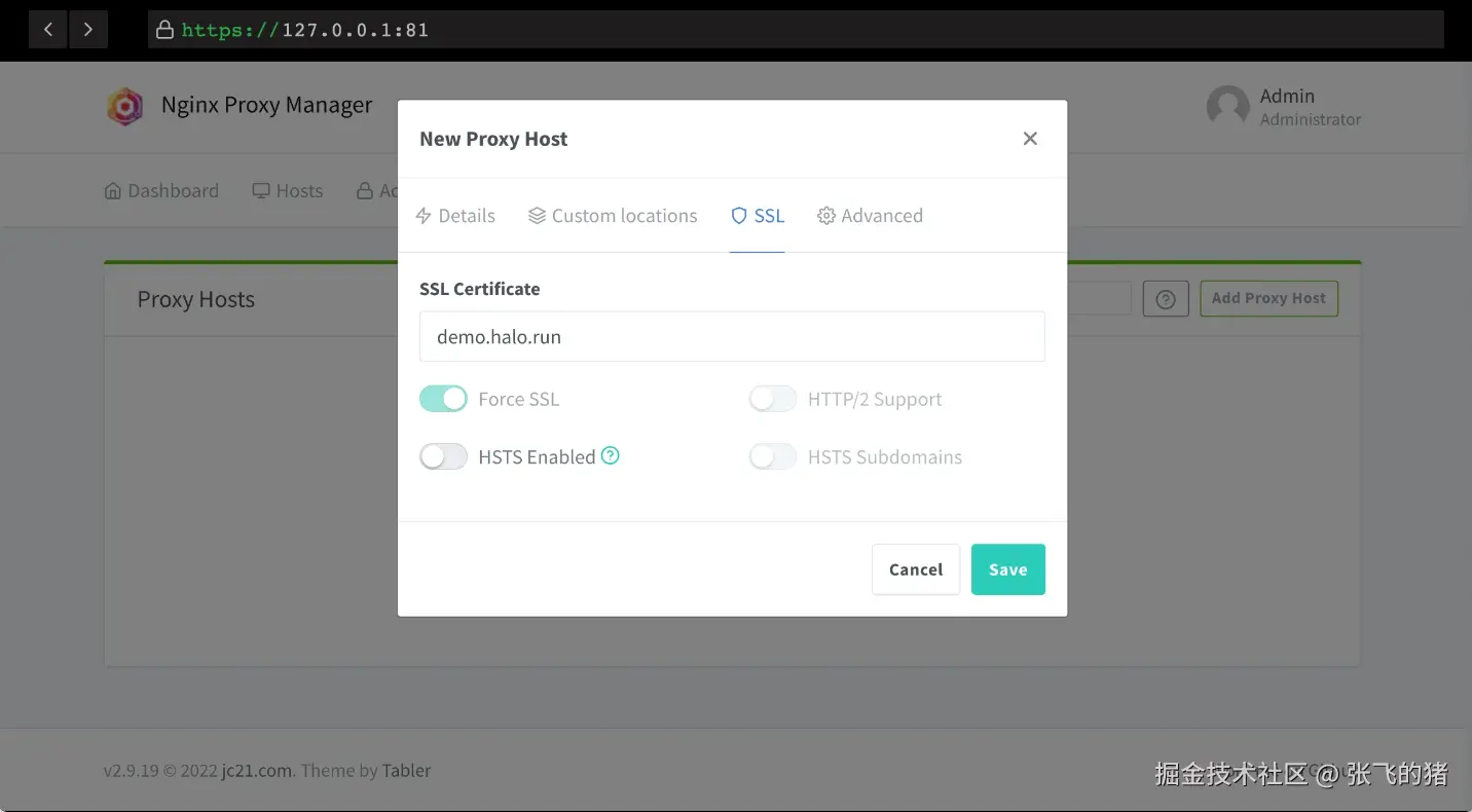 | Forward Hostname/IP | 填入服务器的 IP,或者 Docker 容器内部的 IP(如果 NPM 和 Halo 搭建在同一台服务器上的话) |