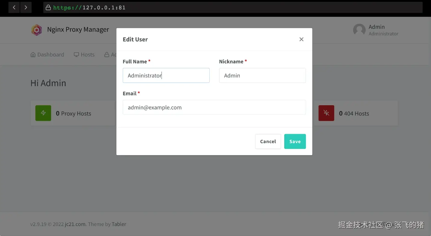 使用 http://127.0.0.1:81 就可以访问 NPM 的网页端了,默认登录的用户名:admin@example.com 密码:changeme。第一次登录会提示更改用户名和密码,建议修改一个复杂一点的密码。