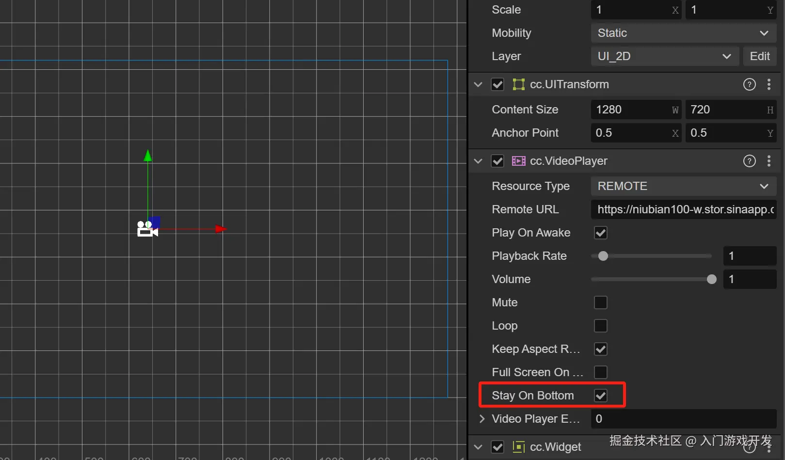 - 在属性检查器中勾选 VideoPlayer 组件上的 stayOnBottom 属性。