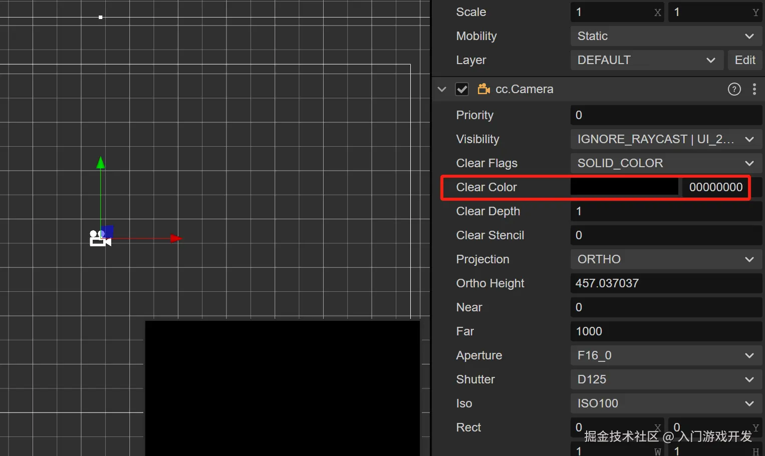 - 在属性检查器中设置摄像机的 backgroundColor 属性透明度为 0。坑点注意:摄像机背景色只能是黑色,否则叠加效果有半透明蒙层。