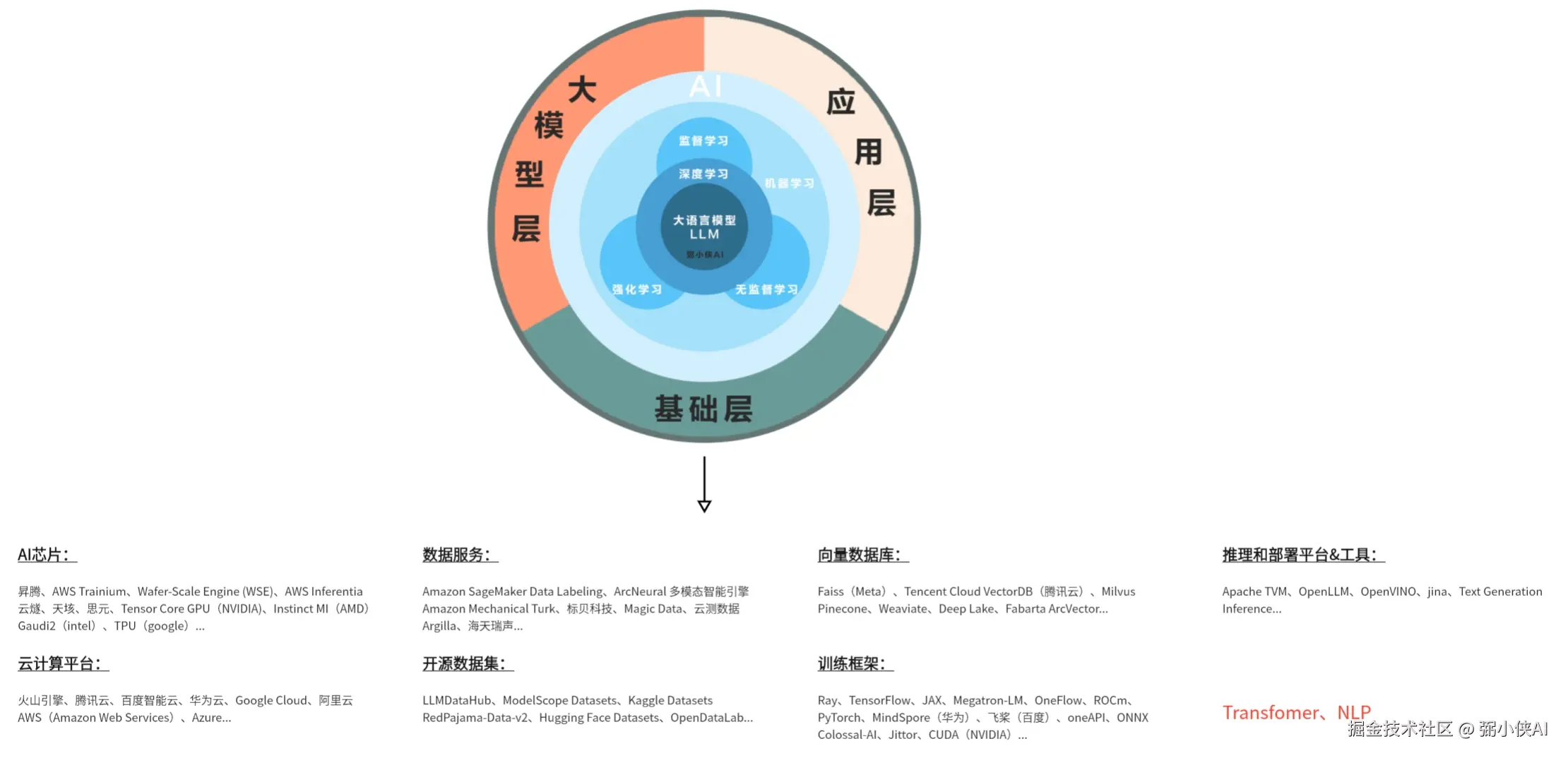 数据服务,开源数据集,向量数据库,训练框架,推理和部署平台等等,这里就不做过多讲解,毕竟跟我们不搞科研的人关系真不大,感兴趣的可以私下了解,对普通人来说,更应该聚焦的是AI应用层和Agent方面的信息。