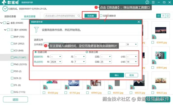 步骤3: 显示扫描结果后,您可以根据自己需要寻找的目标照片去选择相应的图片文件类型。如果需要更加高效地定位目标的照片,建议选择【筛选器】工具,通过选择误删即修改照片的时间,设置限定范围后搜寻目标照片。
