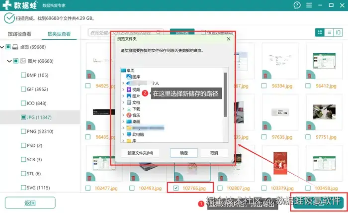 步骤4: 选好照片后,点击【导出】,根据弹出的窗口选择恢复照片后的新存储路径。值得注意的是:不要将恢复好的照片放回原来的磁盘里面。 选择好路径后,点击【确认】即可。