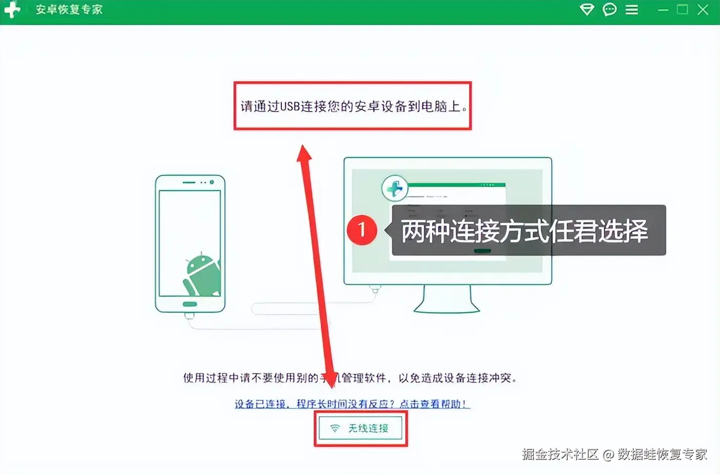第一步:软件为我们提供了多种连接方式,确保手机被电脑识别。只需根据界面上的操作提示进行连接。