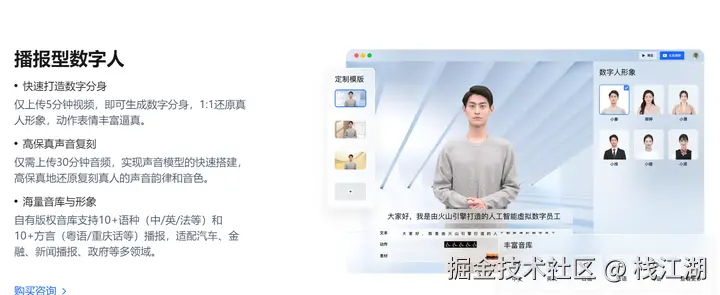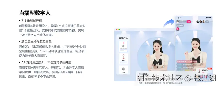 是聚焦于播报、交互、直播3大核心场景,为各行业提供一站式数字人解决方案。