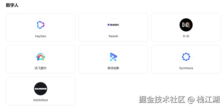 比如数字人,包含讯飞智作、商汤如影、HeyGen等优秀的数字人产品都有收录。