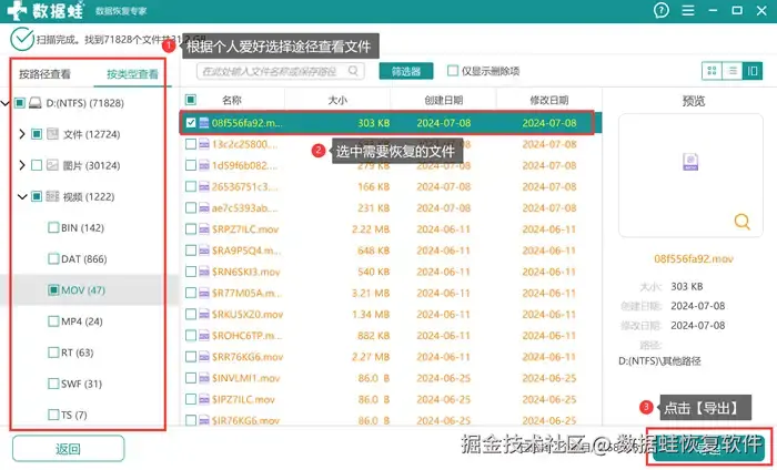 第3步: 扫描完成后出现已经分类好的文件。页面左边,用户可以根据自己的偏好选择【按路径查看】还是选择【按类型查看】。完成目标文件的选择后,直接点击【导出】。