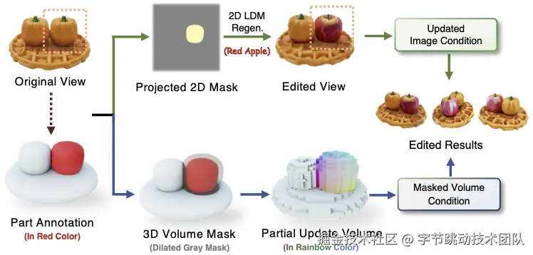 其中是通过融合缓存的控制体素和新更新的控制体素在处更新的体素。通过在 2D 和 3D 条件下启用粗模掩码,本方法可以精确编辑原始对象的局部部分,同时保持其他部分不变。