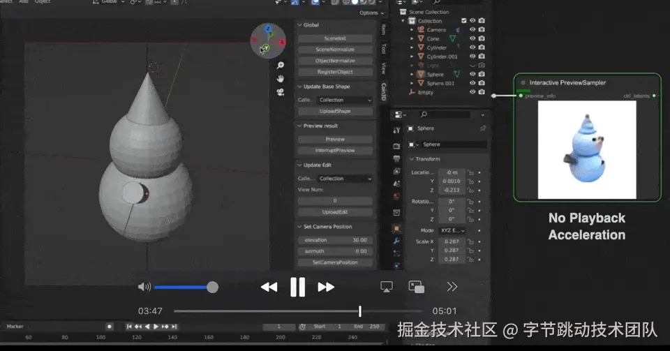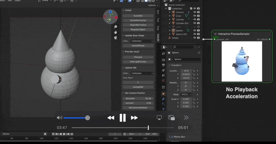 为了保证交互生成的流畅体验,Coin3D可实现在几秒钟内预览编辑结果,并从任意角度检查编辑后的效果。具体而言,Coin3D设计了一种渐进式体素缓存机制,用于记住每个时间戳的最新3D控制体素。然后,在预览阶段,Coin3D将用户在建模软件内的视点变换迁移控制多视图扩散中的视点条件和体素投影。为了使预览功能具有快速响应,Coin3D使用缓存的 3D 控制体素,而无需重新运行 3D 适配器,并在每次去噪迭代中快速解码出每个步骤的预览预览图像,实现拖拽交互式的3D生成预览。