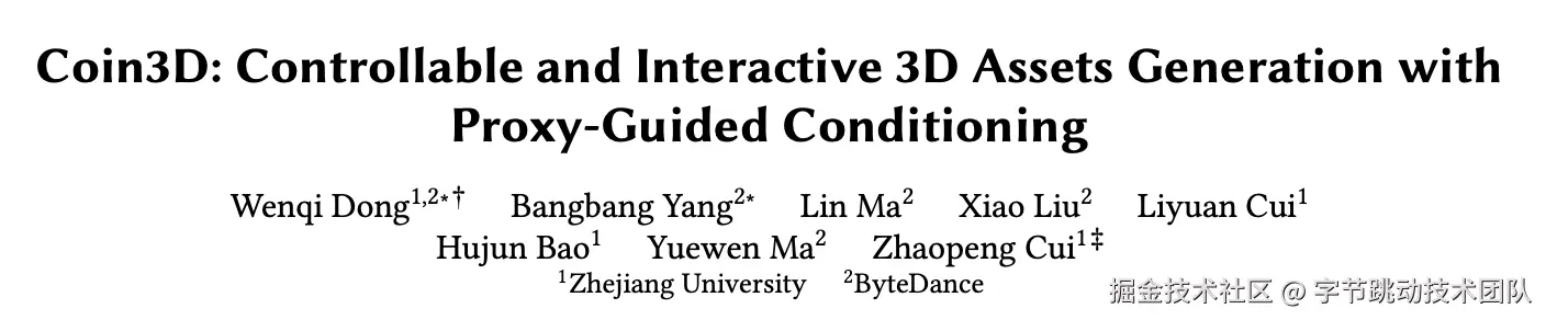 近日,来自浙江大学 和 字节跳动 PICO MR研究团队在SIGGRAPH2024中发表了论文《Coin3D: Controllable and Interactive 3D Assets Generation with Proxy-Guided Conditioning》。该论文提出了一种使用文本描述驱动的3D模型可控生成方案Coin3D,可以根据用户搭建的粗糙几何模型与简单文本描述来生成带纹理的三维模型,在功能上类似于3D版本的ControlNet。
