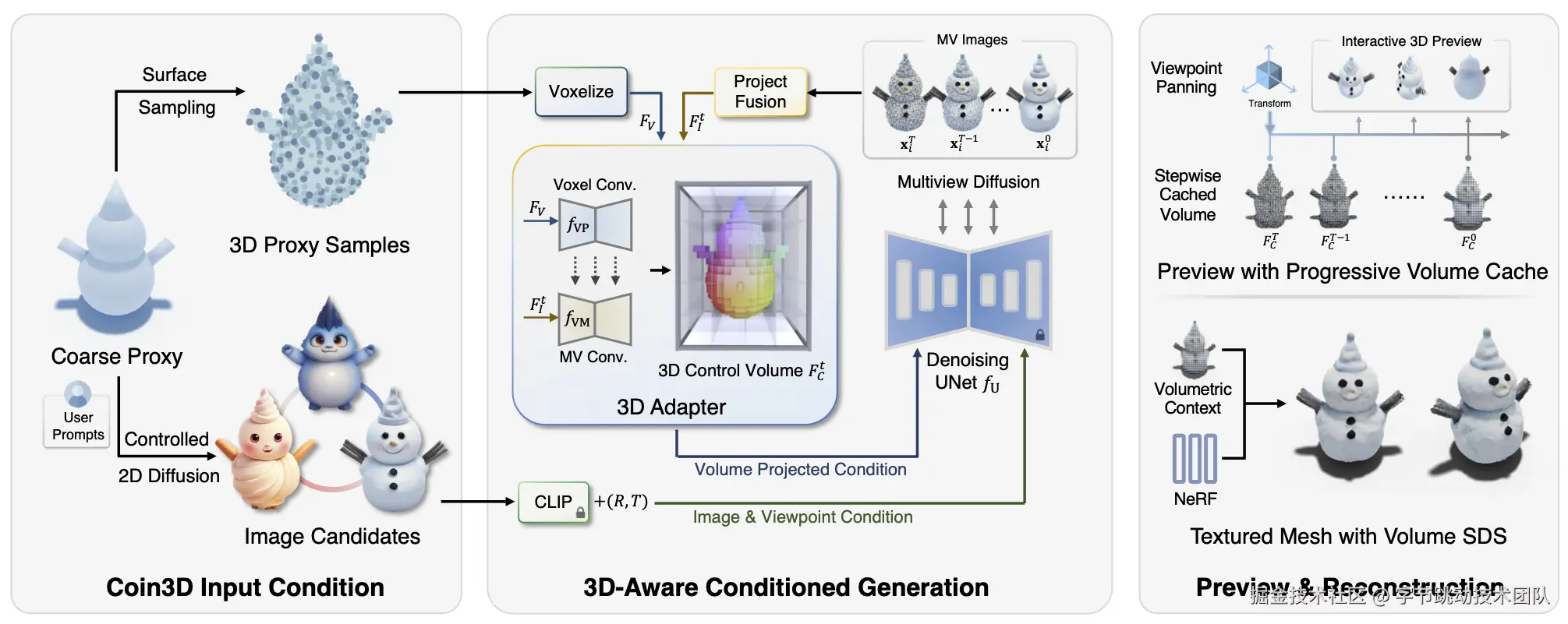 Coin3D引入3D适配器,将3D控制添加至多视图扩散流程,生成遵循粗模形状的多视图图像。Coin3D构建了一个3D控制体素,将3D体素上下文传递至扩散流程。3D适配器接收粗模特征体素和多视图图像融合体素两个输入,先体素化粗模采样点填充零初始化的占用网格,然后通过反投影和融合多视图图像,生成多视图特征量。
