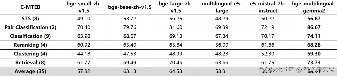 在中文任务即C-MTEB任务上,BGE-Multilingual-Gemma2的中文能力进一步增强,相比之前的bge-large-zh-v1.5有显著提升。