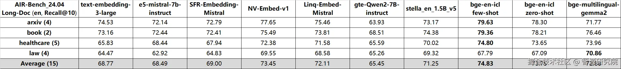 在AIR-Bench上,BGE-Multilingual-Gemma2和BGE-EN-ICL表现出强大的泛化性,在新领域上表现优异,in-context learning能力进一步增强了BGE-EN-ICL的表现。