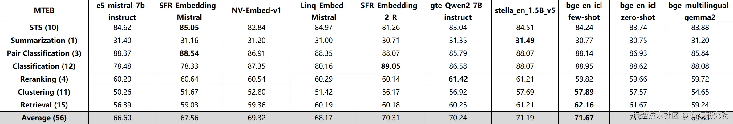 在MTEB榜单中,多语言模型BGE-Multilingual-Gemma2表现出色,而BGE-EN-ICL的few-shot表现尤为突出