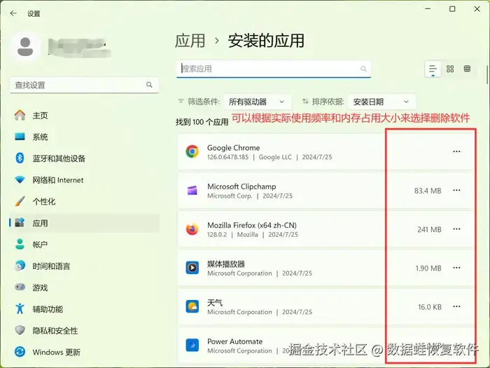 第1步: 打开【设置】,单击【应用】后选择【安装的应用】,打开后可以查看软件的内存占比情况,再根据自己的实际使用频率来决定选择性删除软件。