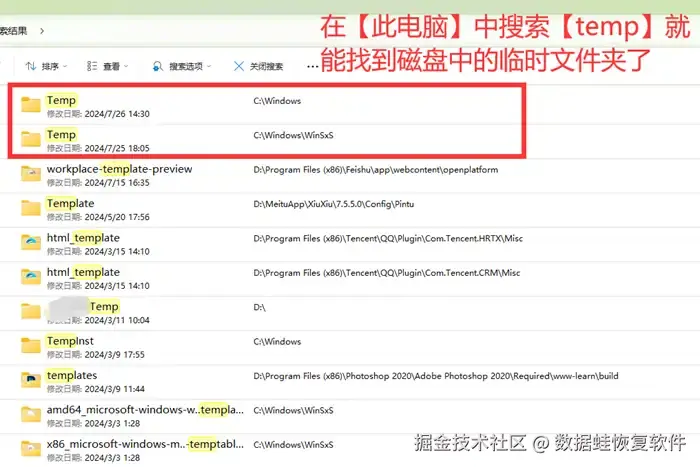 第1步: 打开【此电脑】,在文件资源管理器上搜索【temp】,电脑便会自动帮您搜索出磁盘中的临时文件夹,您再认真筛选需要删除的文件进行删除即可。