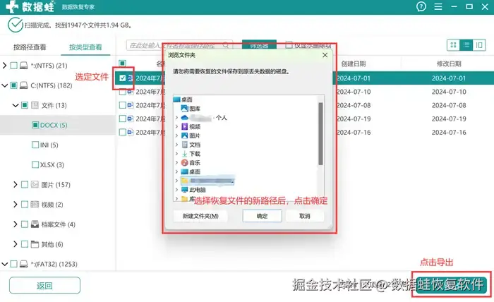 步骤4: 选定需要恢复的文件,点击【导出】,会弹出一个【浏览文件夹】的界面,该界面是提示用户需要选择保存恢复文件的路径。选好后点击【确定】即可。